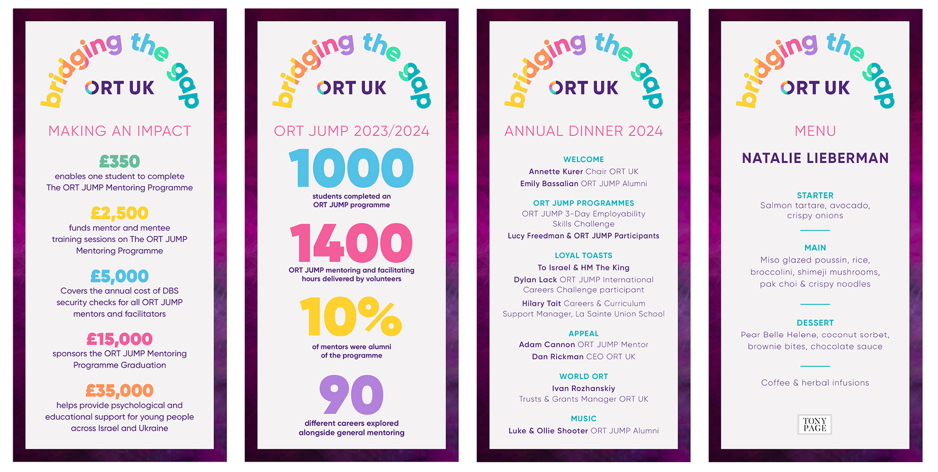 The ORT UK Annual Dinner was held at Nobu Hotel in London for over 200 guests. As my role as Creative Director for ORT UK, I have rebranded the ORT JUMP program bringing in a fresh colour palette that reflects the broad range of professional industries that young students are interested in. The dinner focused on the 5 ORT JUMP programmes and championed the students taking part as well as student alumni, together with mentors, facilitators and teachers. The campaign was “Bridging The Gap” between school and the workplace, and this theme was present throughout the event. The escort cards were double-sided with one side showing a classic HB pencil with handwritten names on lined paper, while the reverse was a classic silver fountain pen on white laid paper with a clean sans serif font showing the name of the guest. The theme continued on the two 4 meter wide sets either side of the wide screen. One a school classroom and the other an office. Guests were encouraged to sit and be part of these spaces that clearly showed the aim of what ORT UK are trying to bridge. We replaced the typical flower arrangements for each table with large spheres that lit up in the brand colours. This created an impactful effect and created a relaxed tone to the experience of the evening. Guest speakers had their names & photos displayed on the screen and my two sons, who took part in the programme when they were at school returned as alumni and performed a few songs. A special moment for me to be proud of them and mix my work with my family life… You can find out more about ORT UK and see more of my creative designs on their website at ortuk.org Event photography by the talented Blake Ezra © blakeezraphotography.com