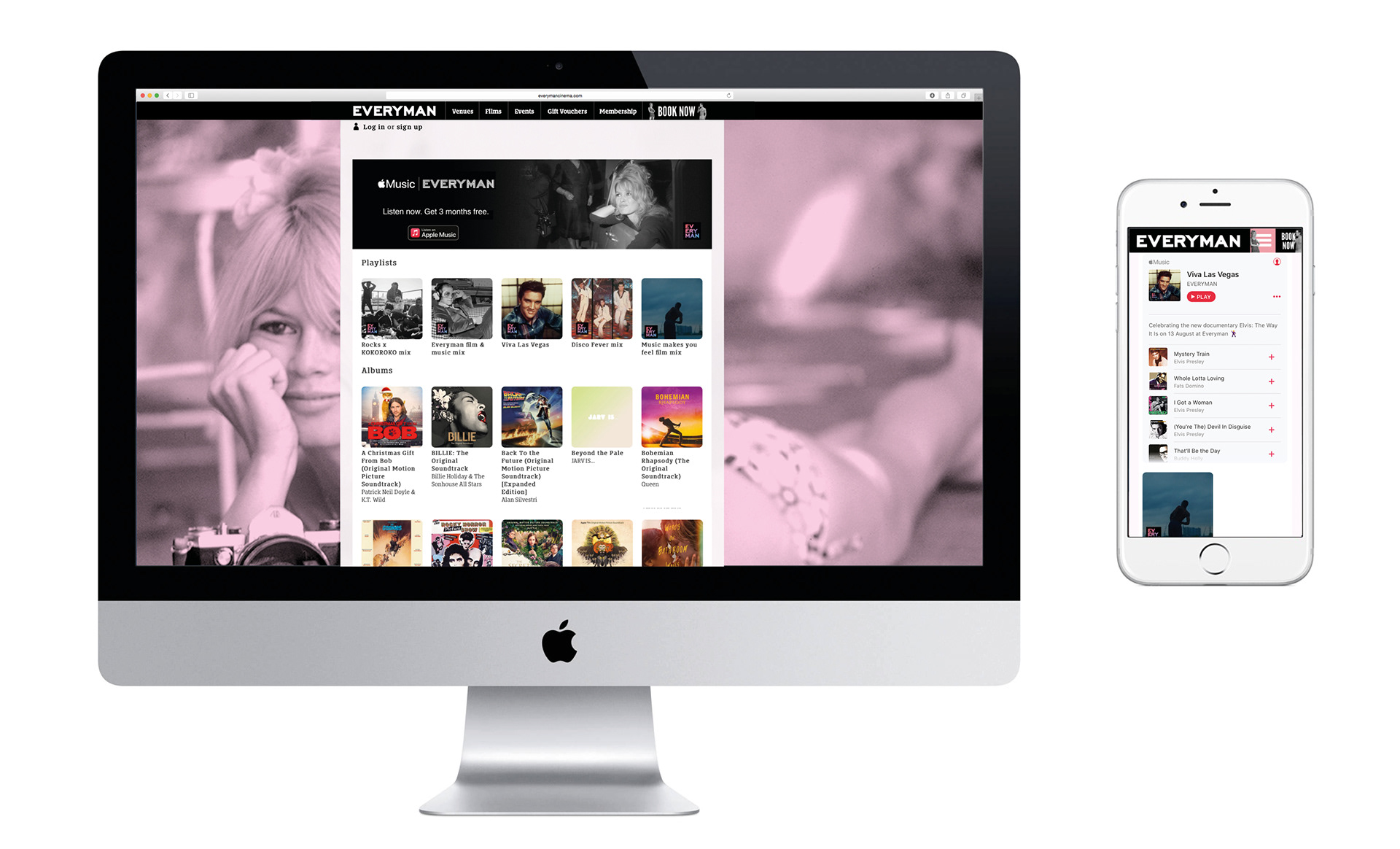 This section showcases the latest website I created for Everyman. Always keen to keep up and ahead of the ever changing digital landscape, this is Everyman’s first fully responsive website. Research highlighted that since it’s creation, the majority of users book on their mobile device, so it was always important to understand the customers needs and respond accordingly. Always making improvements such as easy payment with the introduction of Apple Pay and later on, being the first business to have an integral Apple Music Curator page within their own website. The pink background became a key brand colour for Everyman and the colour palette on the homepage allowed us to champion new films and content and compliment it whilst still being very much part of the Everyman brand and experience.